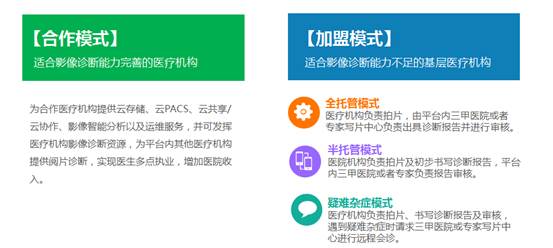 其次,針對不同醫院影像業務的實際難題的不同,平臺具備多種服務模式,可滿足不同醫院的業務需求。針對影像診斷能力較強的醫院,采用“合作模式”,為醫院提供云存儲、云PACS、云共享/云協作、影像智能分析以及運維服務。并可發揮醫療機構影像診斷資源,為平臺內其他醫療機構提供閱片診斷,實現醫生多點執業,增加醫院 收入。針對影像診斷能力較弱的醫院,采用加盟模式,并提供全托管、半托管、疑難雜癥模式供選擇,形成了多種模式并行的影像運營服務體系。